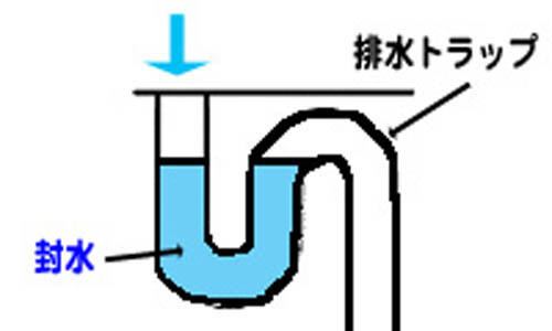排水トラップとは下図のようなもので、たまっている水を封水といいます。